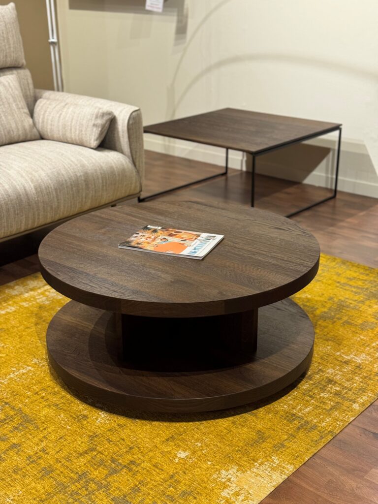 Couchtisch C3 in exklusiver Sonderausführung, rund, in der neuen Holzausführung Eiche geräuchert.
