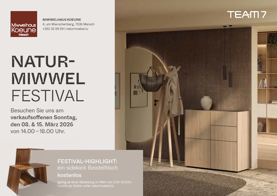 Die Aktion ist gültig vom 07.03.2026 bis einschließlich 28.03.2026 und bezieht sich auf Ihren Einkauf von TEAM 7 Möbeln ab einem Brutto-Auftragswert von 10.000 €.